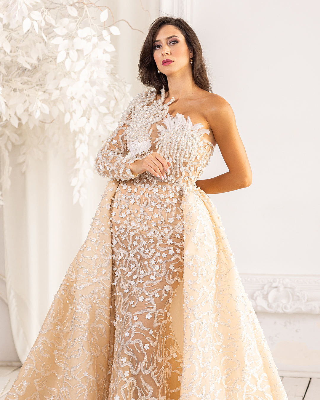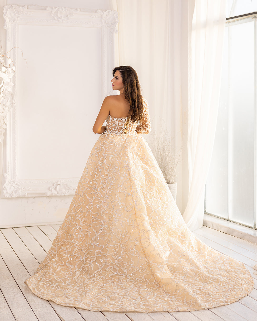 A majestic golden gown with rich Arabic-inspired detailing and a luxurious silhouette. Designed to embody royalty, power, and timeless beauty.